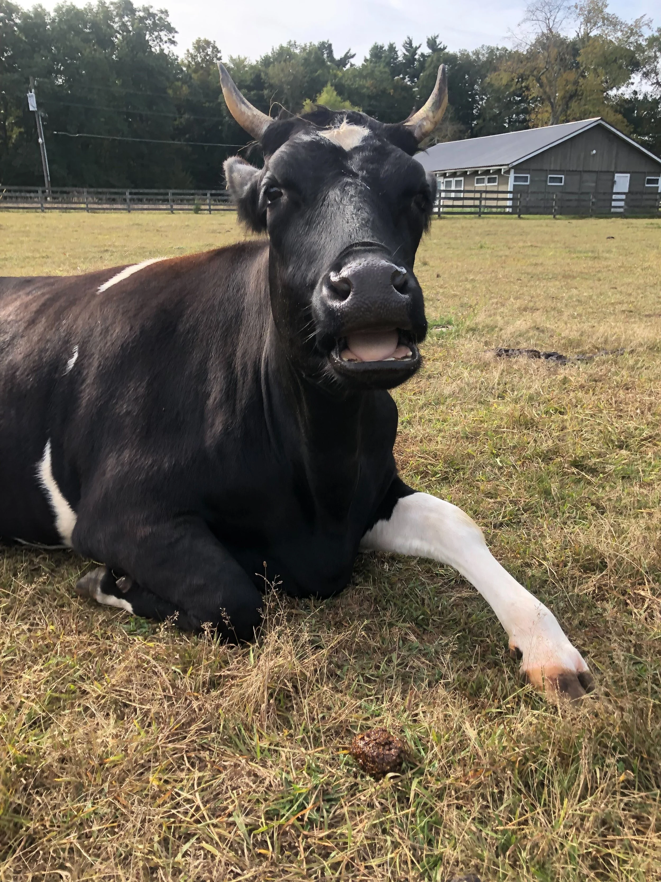 Ruthie was just three years old when she arrived at Woodstock Sanctuary, but lives alongside our older group of cows because she is so gentle and petite. Ruthie will come racing to the fence any time a human is near, eager for some pets and scratches. She still looks out for Franklin and has begun to bond with her new herd—Mikey, Penny, and Maybelle. We cannot wait to watch her continue to grow and thrive.