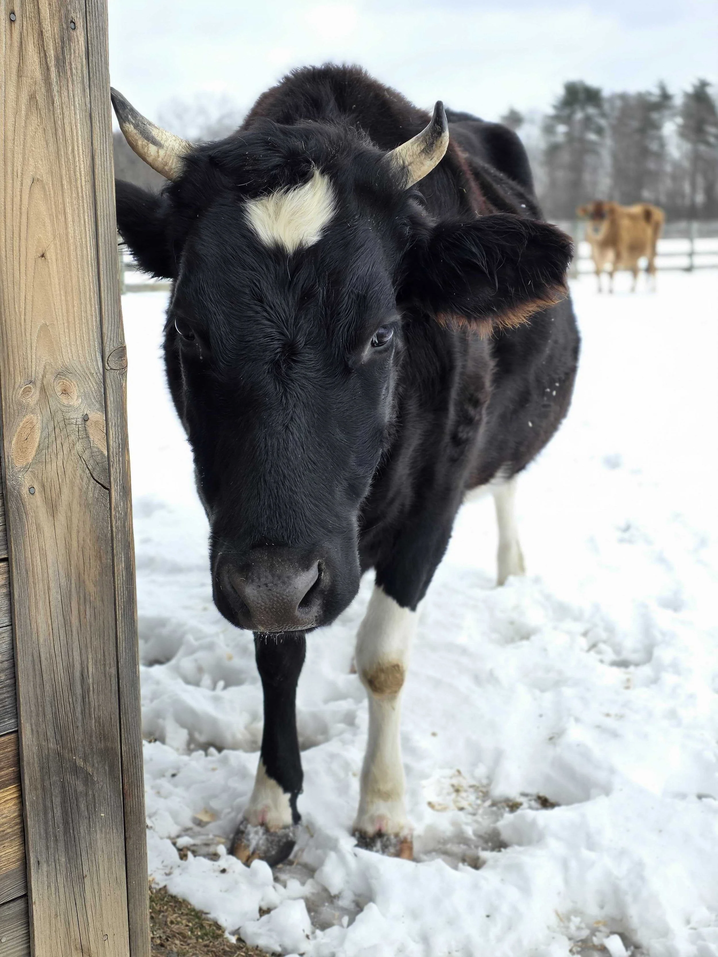 Franklin is a senior cow who was also born at a local dairy farm. He was given to a petting zoo as a baby, where, sadly, he lived his life alone for eight years. In 2023, Woodstock Farm Sanctuary learned of Franklin’s living conditions and of several recent injuries. After a public campaign, he was released to Squirrelwood Sanctuary. Franklin was so nervous around the rescued cows, having never grown up with his own kind. Ruthie, however, was patient and gentle with him, and the two formed an inseparable bond.