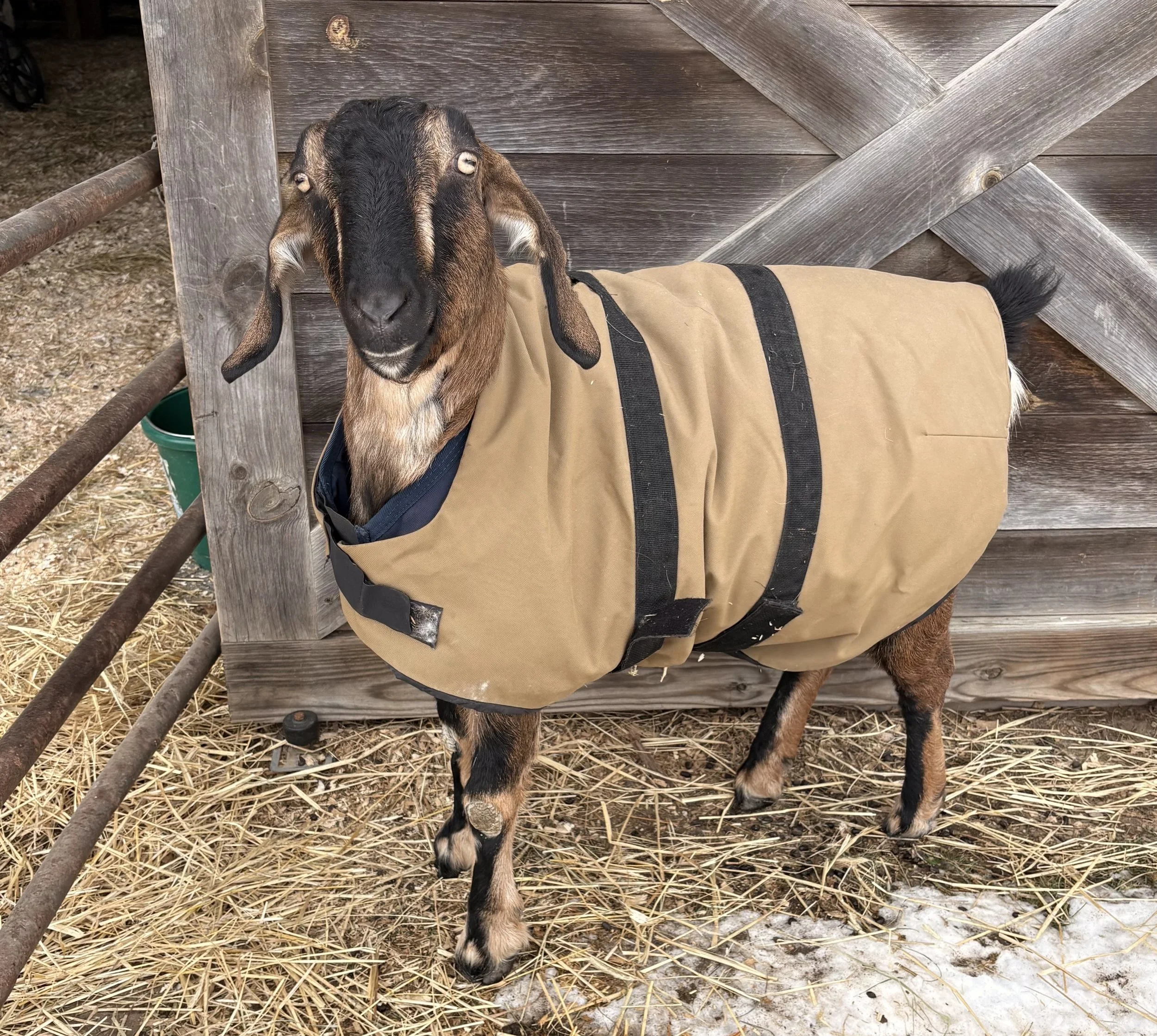 When Evie arrived, we also learned that she had a chronically diseased udder. This was, not only painful for her, but put her at risk of developing a life-threatening infection. In December 2025, Evie underwent a mastectomy and has now fully healed from this procedure. She is so happy to be living alongside fellow goats once more, snuggling in clean bedding and getting lots of attention. She is so patient with youngster James and puts up with a lot of his antics!