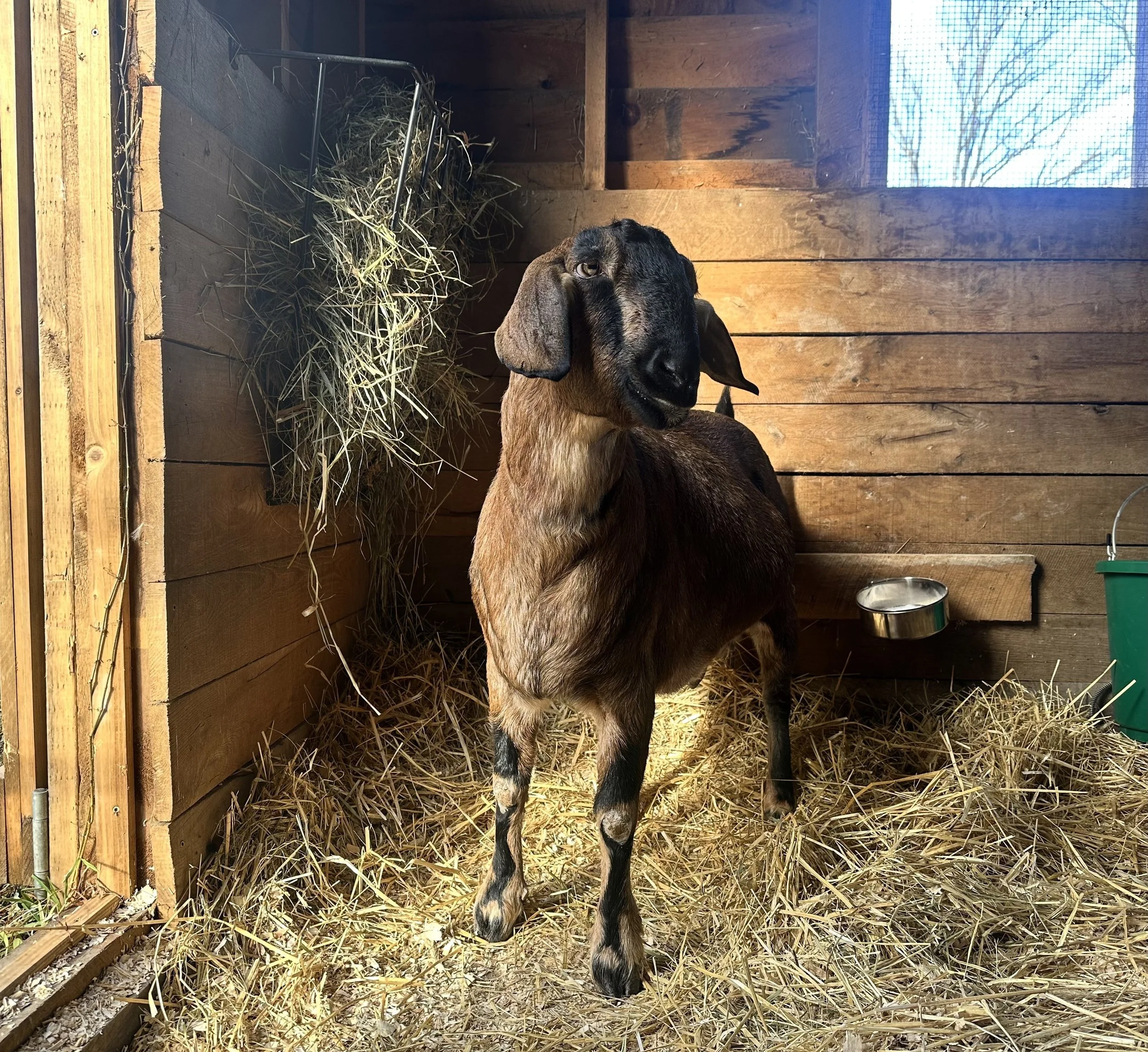 Evie is was about seven years old when she arrived at the Sanctuary in October 2025. Evie is a Nubian goat, a breed often exploited in the meat and dairy industries, and a family was raising her as a 4H goat. Fortunately, she and her sister were spared this fate and adopted as companions when the family relocated. Evie’s sister passed away in autumn of 2025, and her new family grew concerned, as they did not want her to be alone.