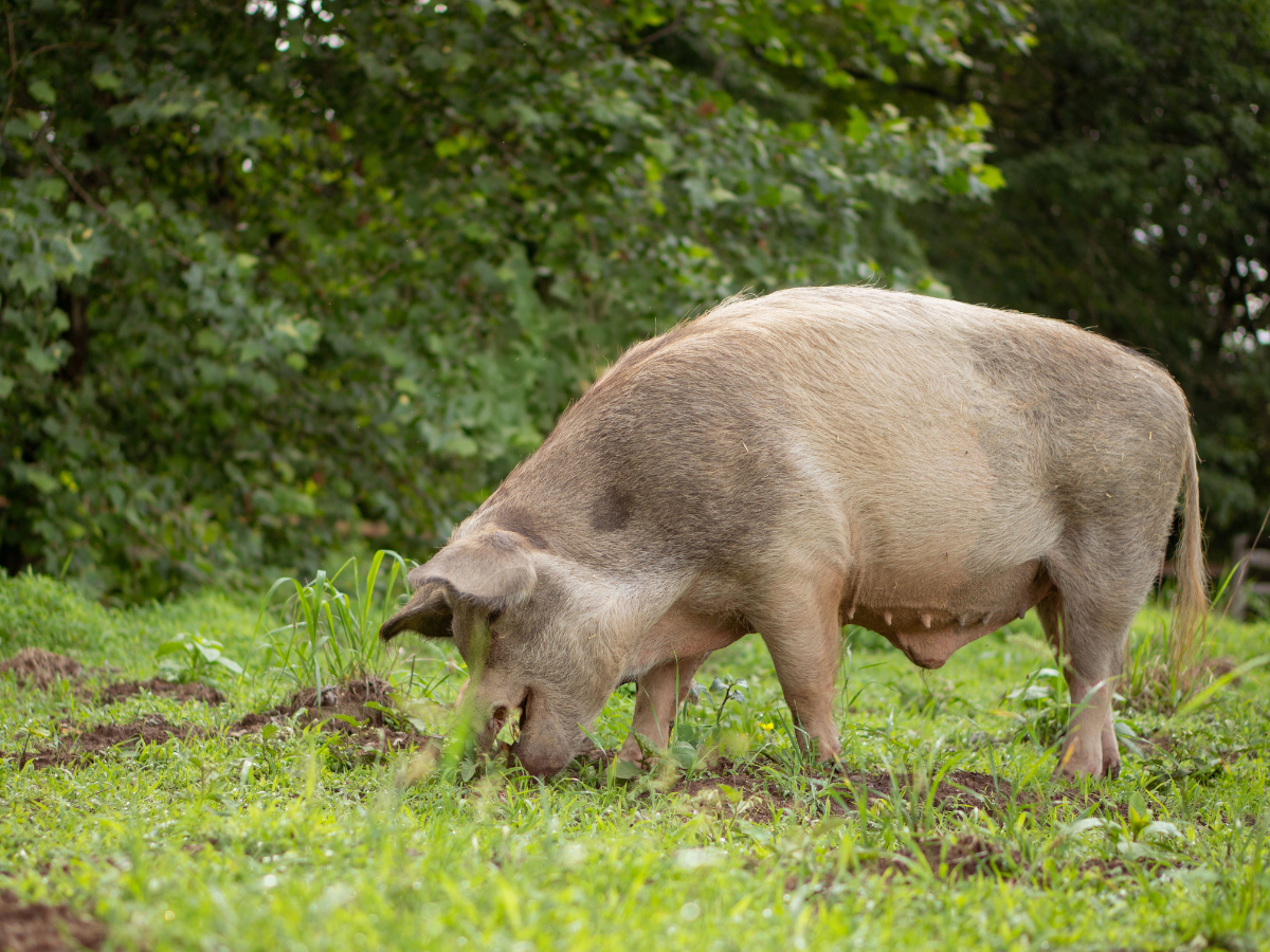 In 2011, Olive was spotted running along Route 28 near Woodstock, New York. She was reported to the police and SPCA, who called us to step in once they brought her to a safe place. Olive truly became the queen of the pigs! She was loved by so many, and her big ears—and even bigger personality—made her impossible to forget. Olive shared a space with her best bud, Stanley, but she made the rules.