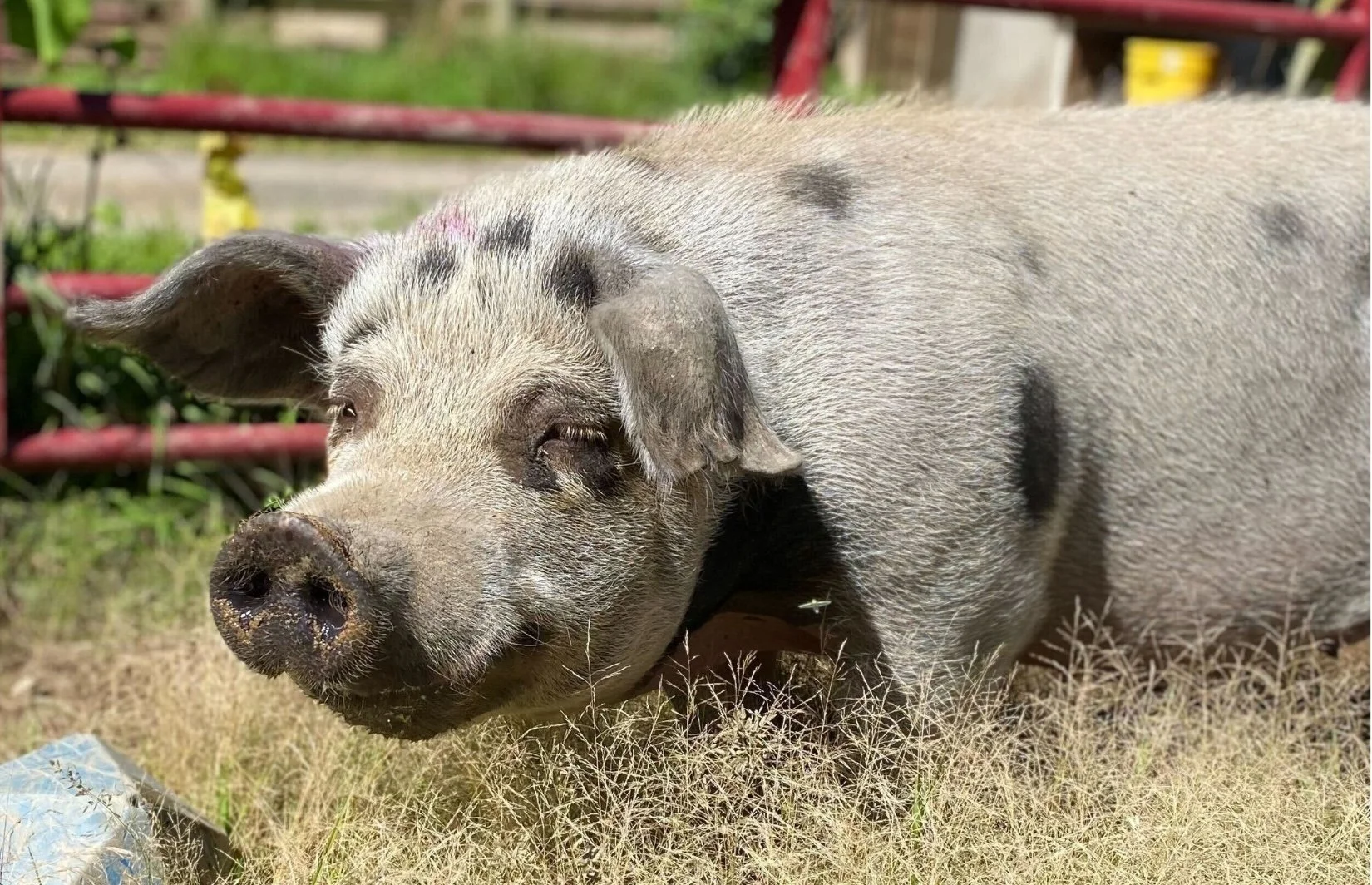 Thanks to our amazing community, we were able to extend our pig pasture with new fencing and Bunny finally joined us in sanctuary. For a couple years, Bunny lived solo in her large pasture, by choice. She interacted with the other rescued pigs through the fence but had no interest in befriending them. In 2024, we introduced two of our newest rescues, piglets Sylvia and Marge, to Bunny’s pasture. They have been cohabiting peacefully ever since and, although Sylvia and Marge can be troublemakers, they give Bunny her space when she needs it. Bunny’s favorite food is apples, and she loves a good nap! Now she is even happy to share her wallow with her new friends and will boldly approach visitors for snacks.
