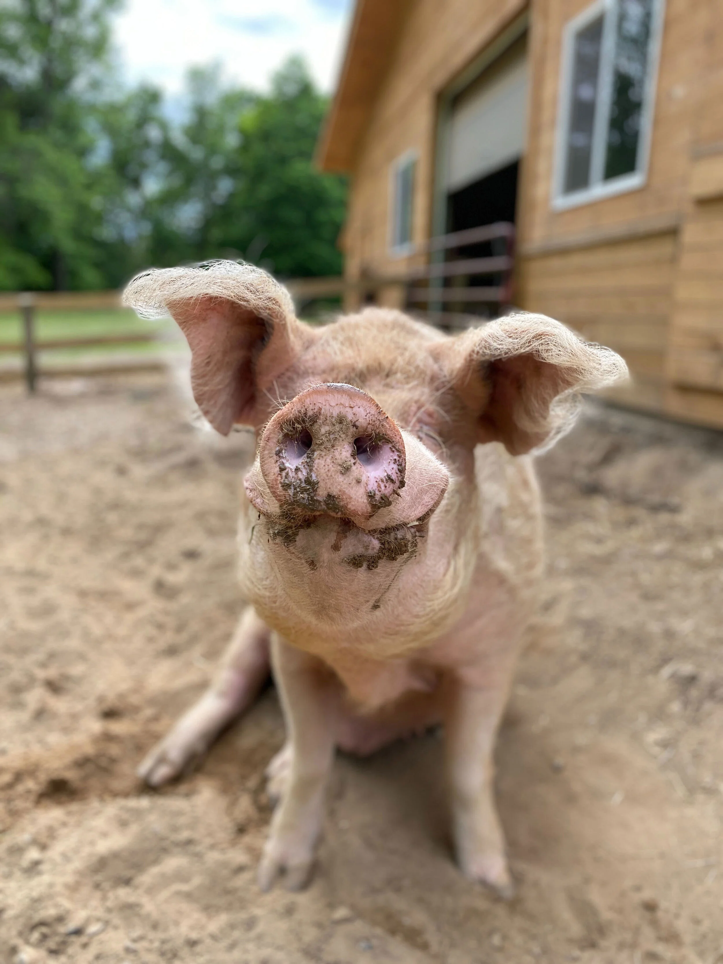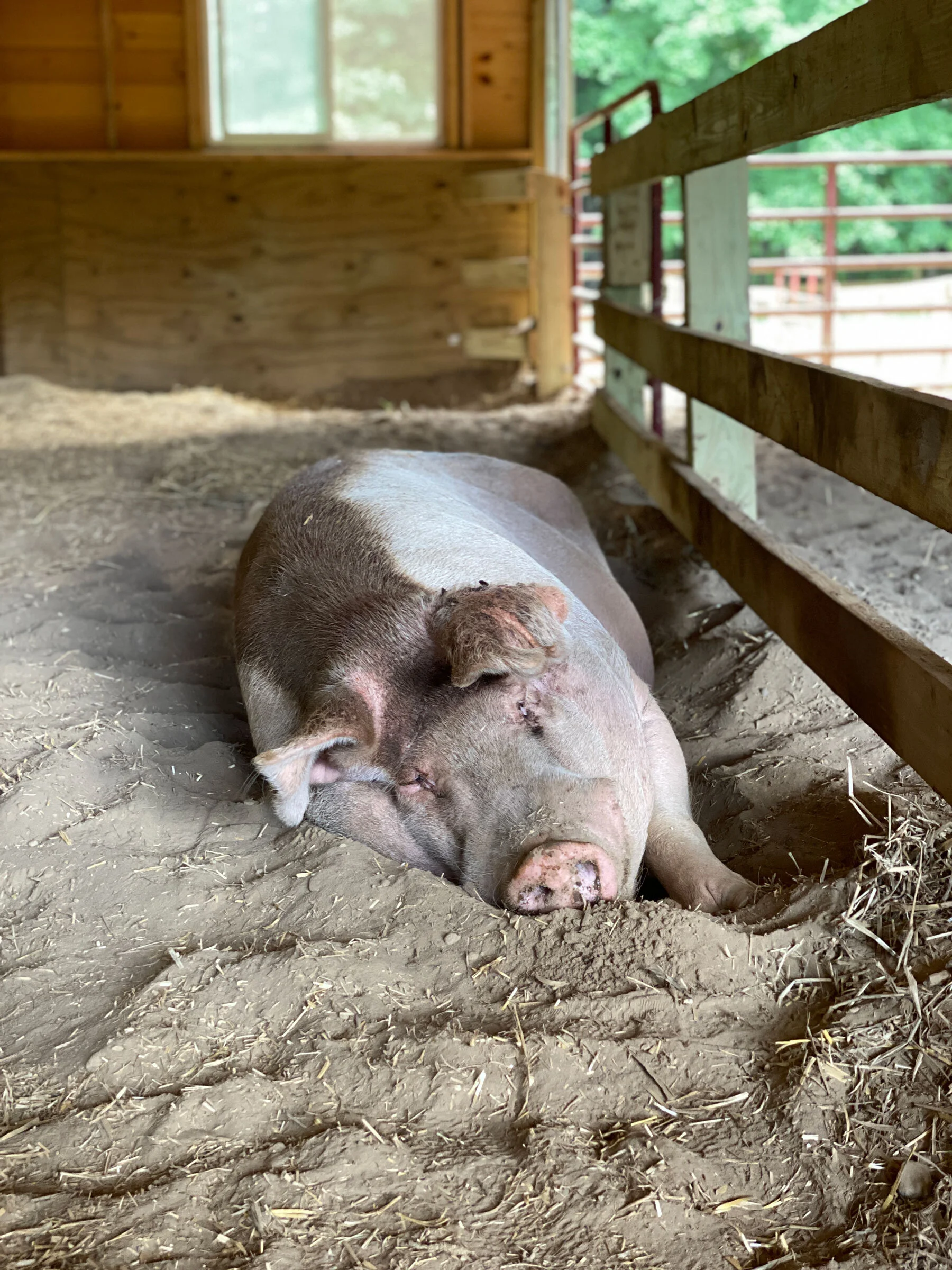 Shortly after Stanley arrived, he bonded with the Sanctuary’s senior pigs, as he was still so small and gentle. Stanley has truly defied the odds and now may be one of the oldest large pigs out there! He spent many years napping beside his roommate and best friend Olive, who sadly passed in 2025. He still occasionally explores his pasture for any special snacks and chats with the other senior pigs. Stanley saved his own life and escaped the fate of being killed for human consumption, another rescue story proving that all animals, including farmed ones, want to live.