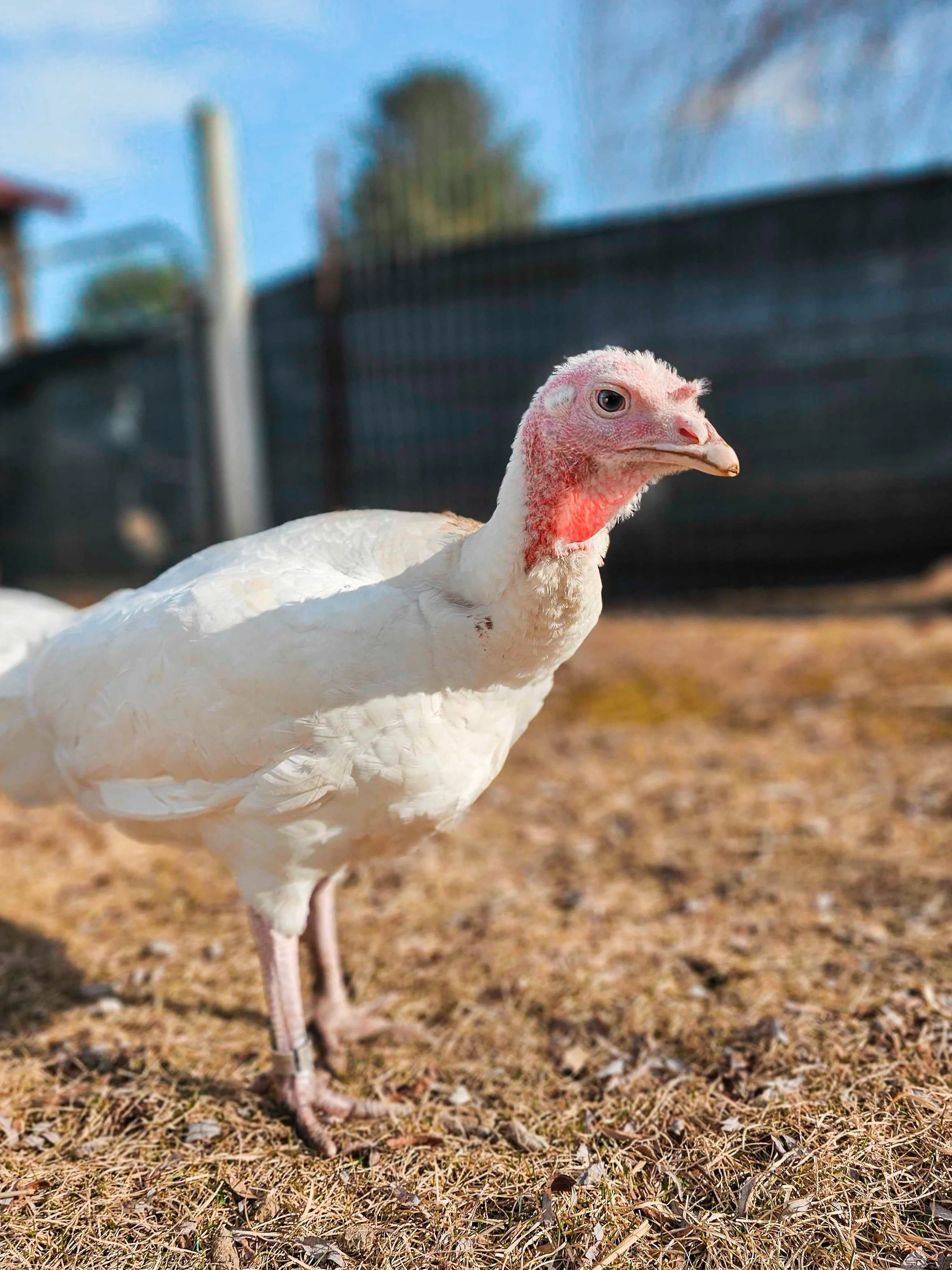 Thankfully, Drew is now doing much better and is safe and happy in her own pasture. We are so thankful we are able to provide Drew with the love, kindness, and care she deserves. Now grown, Drew is a gentle turkey who enjoys her days alongside her best friend Lesley and our older flock, exploring the grass, the shade, and — in the warmer months — their pool! Drew loves to get into mischief…she always seems to be a little bit dirty!