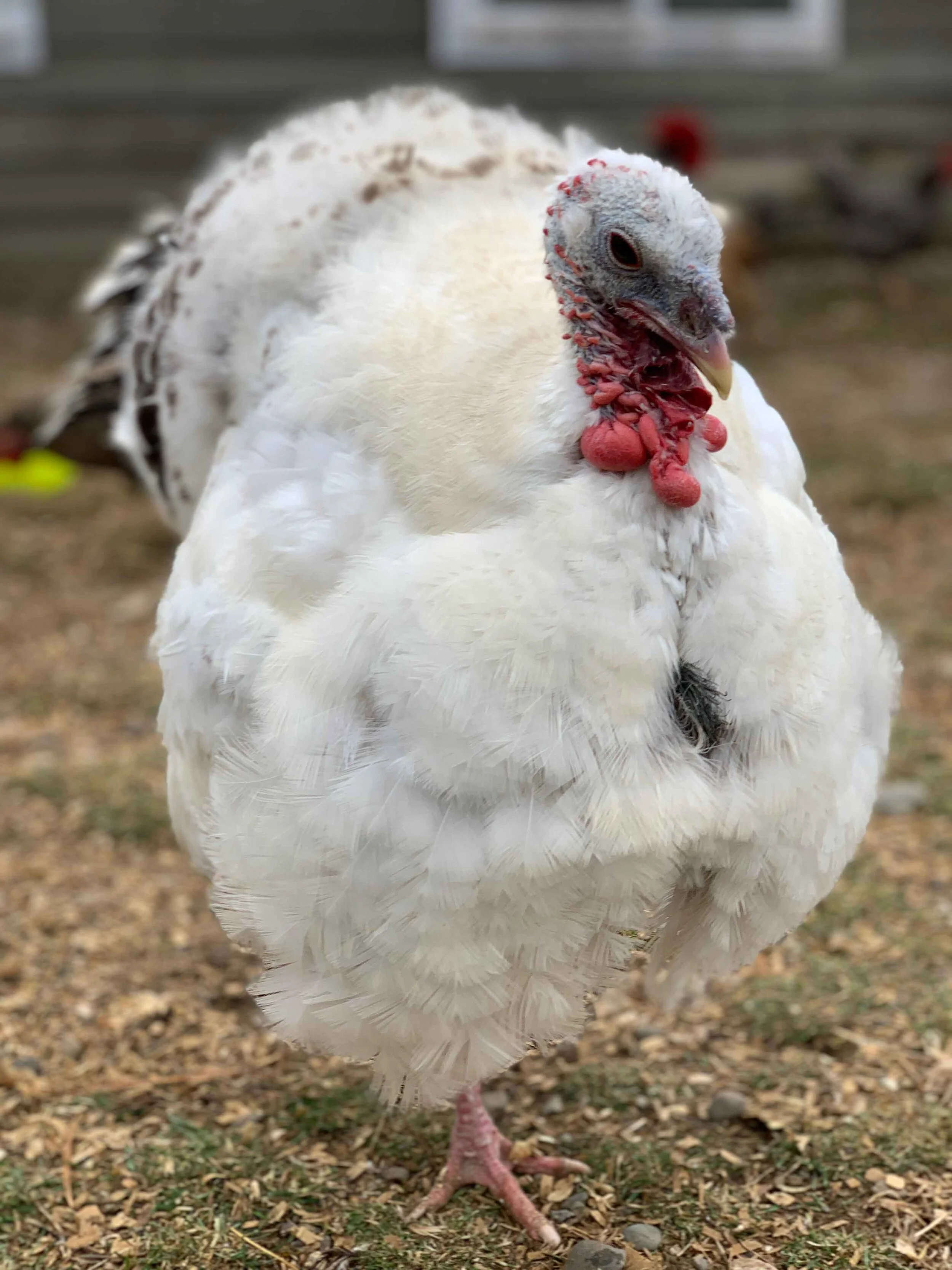 Thankfully, a kind person couldn’t stand seeing this neglect and stepped in. They convinced Tiny’s caretaker to let them bring all three girls to safety at Woodstock Farm Sanctuary in spring of 2018. Tiny began to thrive after receiving the immediate care she needed. For a turkey named Tiny, her personality is as big as can be. Tiny loves to display her feathers to show off how gorgeous she is. But once Tiny gets to know someone, this sweet girl loves to cozy up to visitors and fall asleep.
