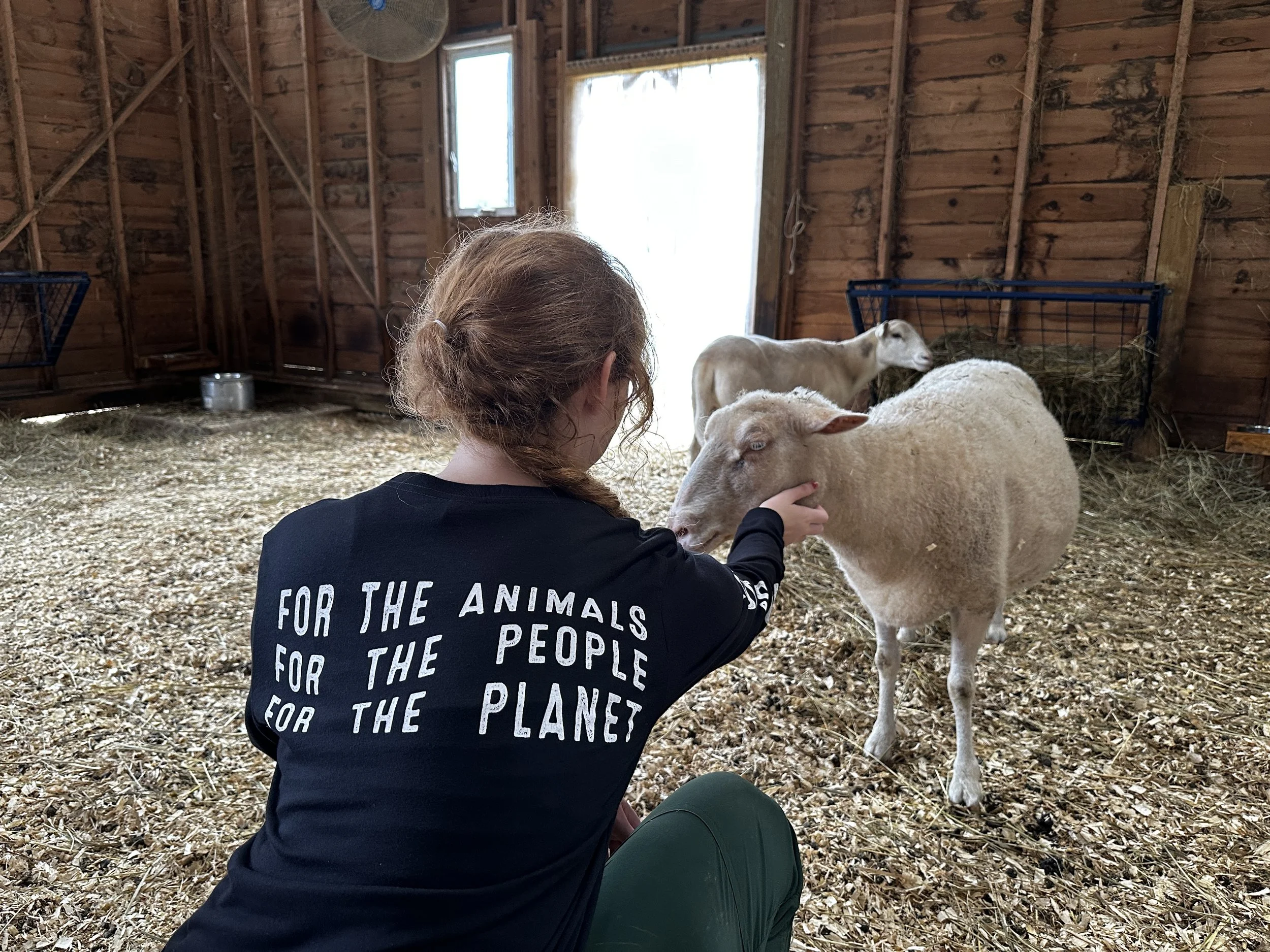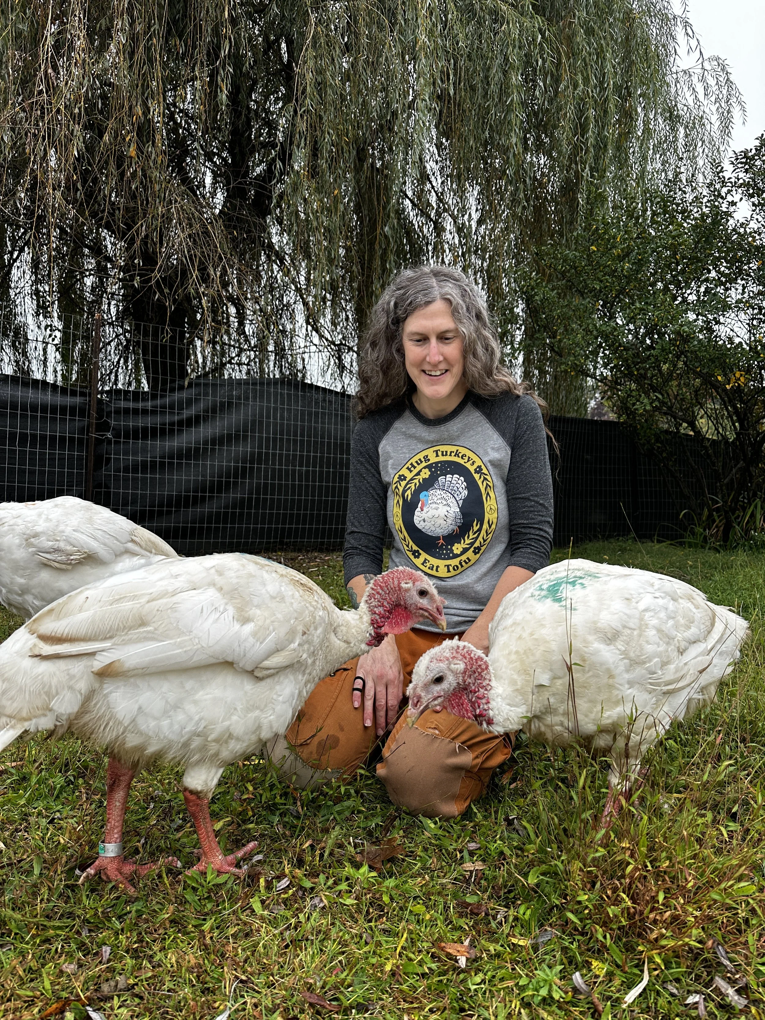 Naturally during the fall season, we love to spotlight the rescued turkeys. This year, the “Hug Turkeys, Eat Tofu” shirt from a few years ago returns! This was a popular design that we had LOTS of requests to bring back and it finally happened. During a season when almost 46 million turkeys are killed every year for Thanksgiving in the US, we say: let's hug them instead! Proclaim your love for turkeys and your preference for tofu with this this comfy tee. It’s a triblend 3/4 sleeve tee from Royal Apparel that’s made in the USA and printed locally in Kingston NY! Caregiver Amy modeled the shirt for Cher, Tai, and Dionne, who approved.