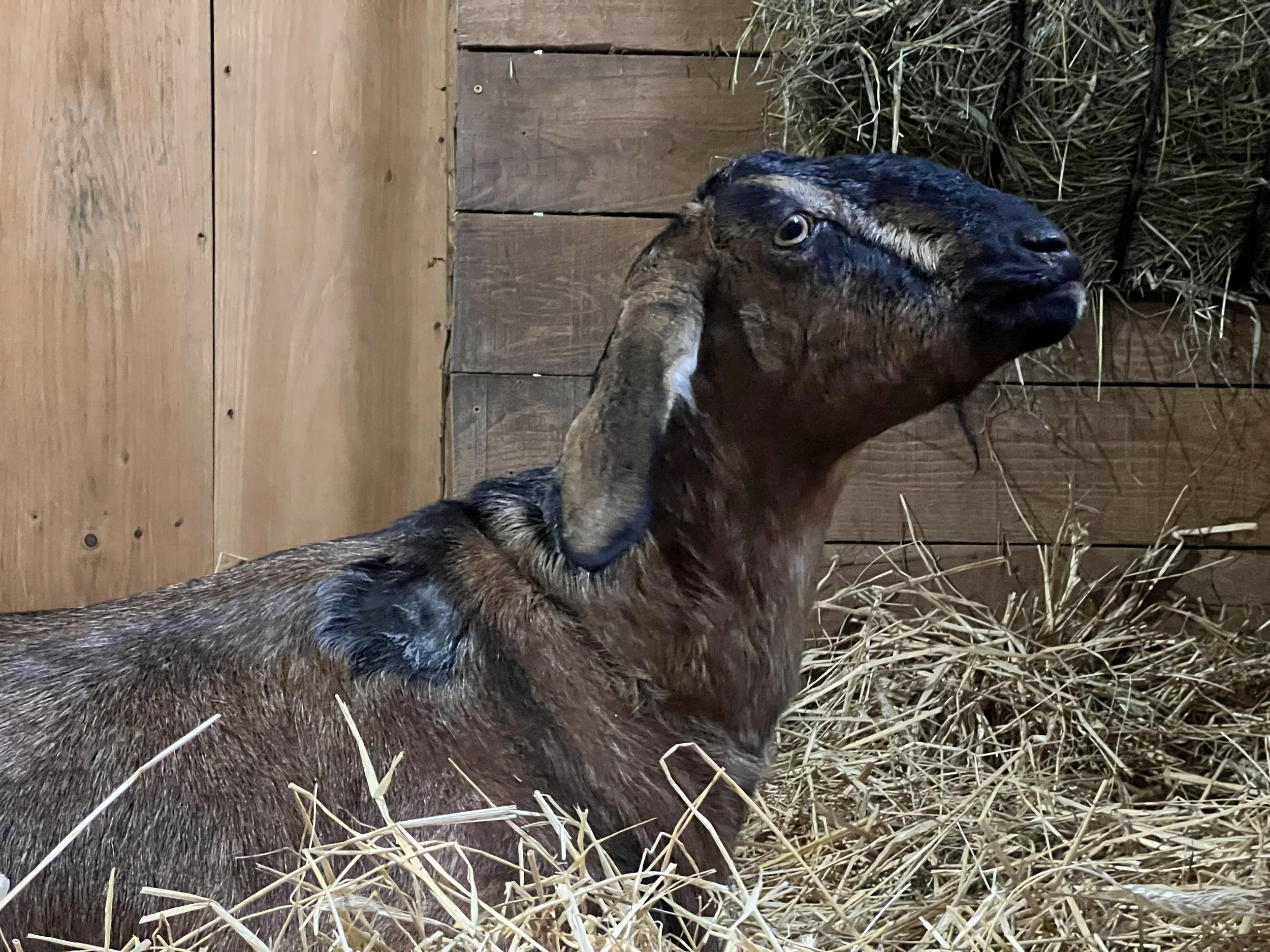 Early one morning at the end of October, we got a call that a seven year old goat in Pennsylvania had been injured by a bear. Evie is a former 4H goat who was adopted out after she’d been raised in the program. Evie’s caretaker had actually been looking for a new home for her since her companion goat had recently passed away and sweet Evie was all alone. Unfortunately, a bear made their way onto the property, likely hungry and stressed since winter is on its way, and encountered Evie. The caretaker intervened and scared the bear off several times, but the encounter left Evie in shock, with several wounds. She was quickly seen by a vet and her caretaker looked for emergency rescue placement to prevent another incident.