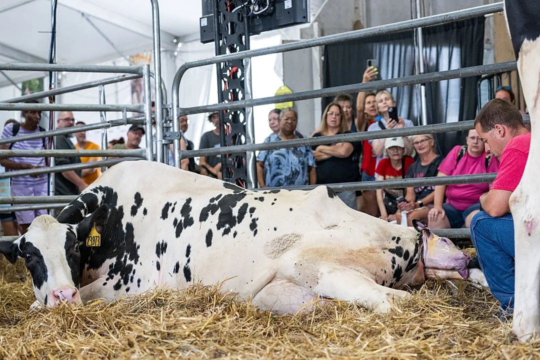 A dairy cow at a large agricultural fair gives birth to a calf in front of a live audience at an agricultural fair. She and other pregnant dairy cows in the fair birthing center are induced into labour at the fair so that attendees can watch. New York State Fair, Syracuse, New York, USA, 2024. Jo-Anne McArthur / Woodstock Farm Sanctuary / We Animals